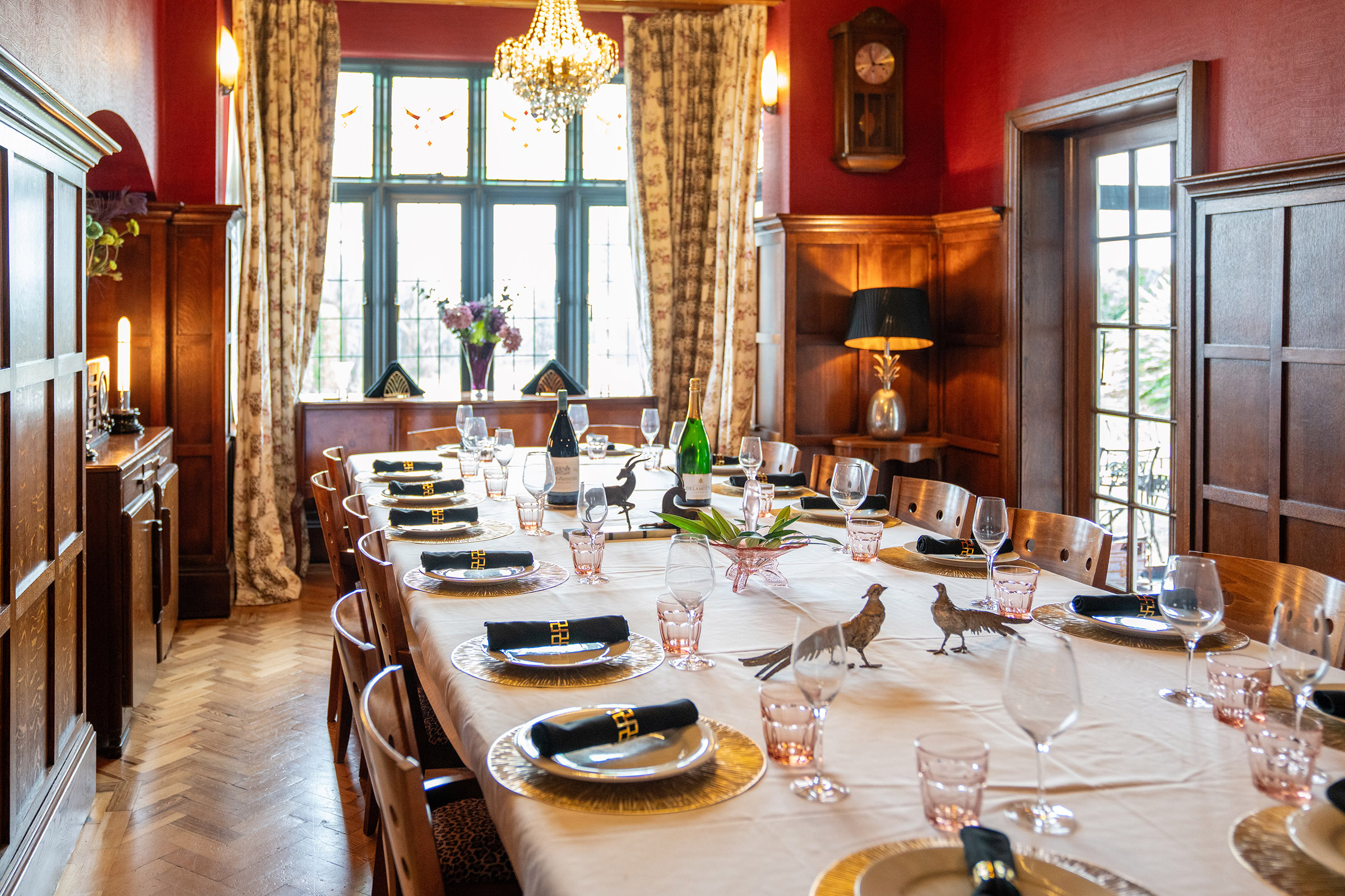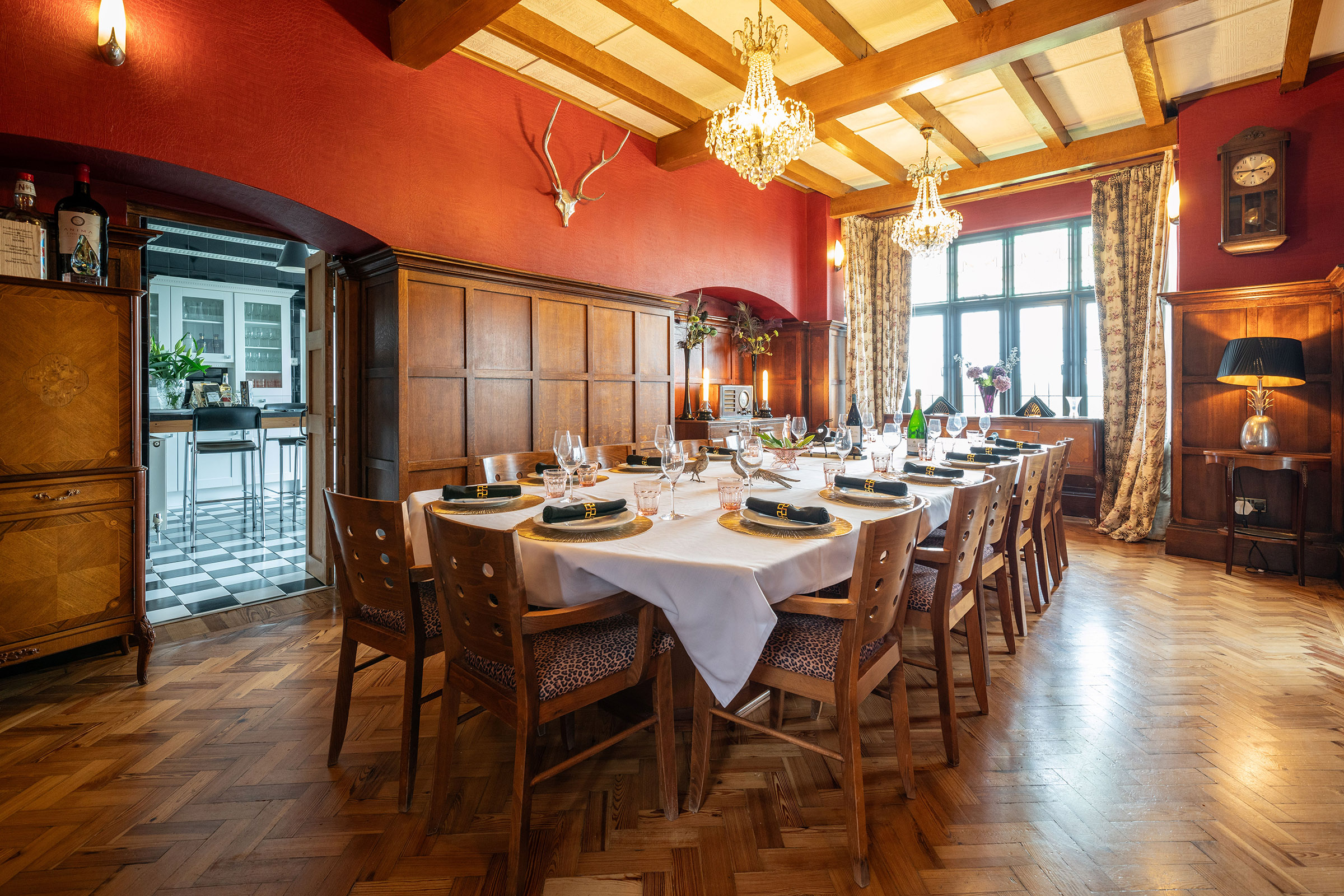 This room is much as it would have been nearly 100 years ago: The magnificent table can easily seat 18 people for that special occasion dinner. The lighting is delightfully atmospheric and glows from the deep red walls. On one side is an amazing radio found in France, although unfortunately it no longer picks up the sound of the Gatsby that once came from its speakers (but we have hidden a SONOS speaker inside so you can pretend and play anything you like from it).