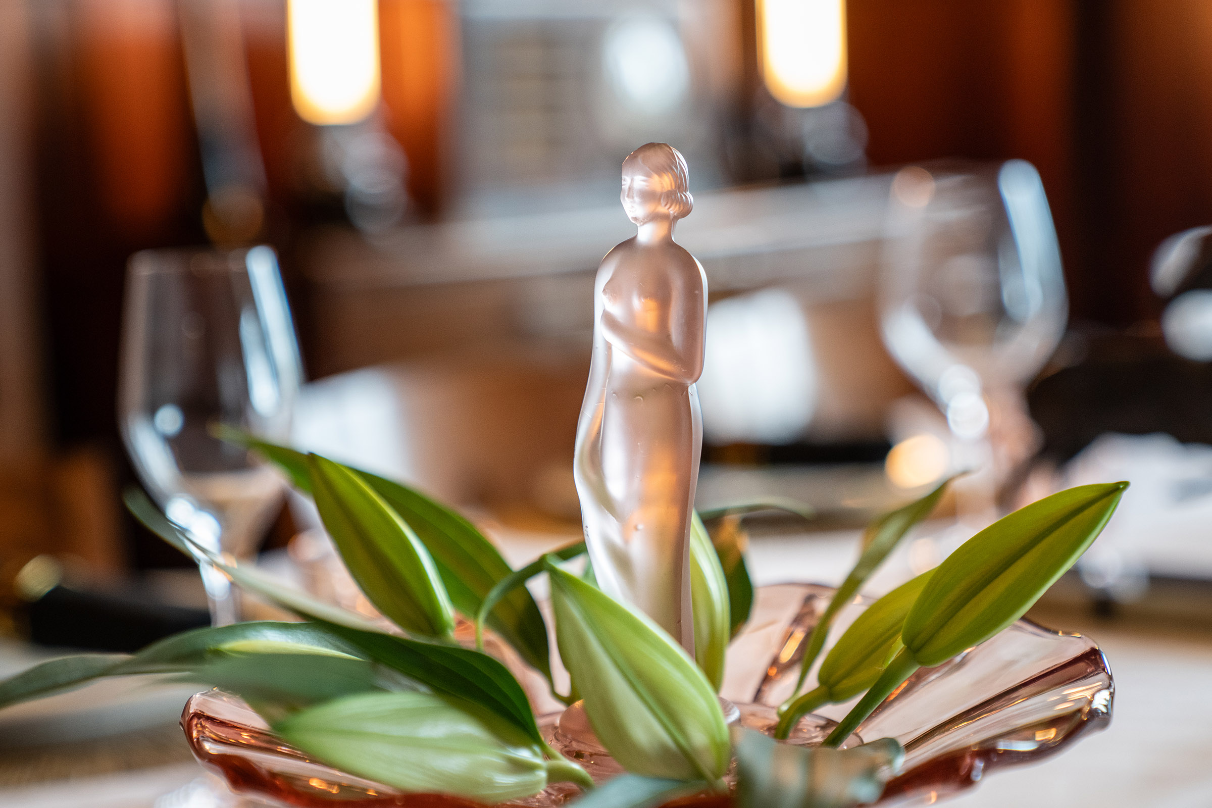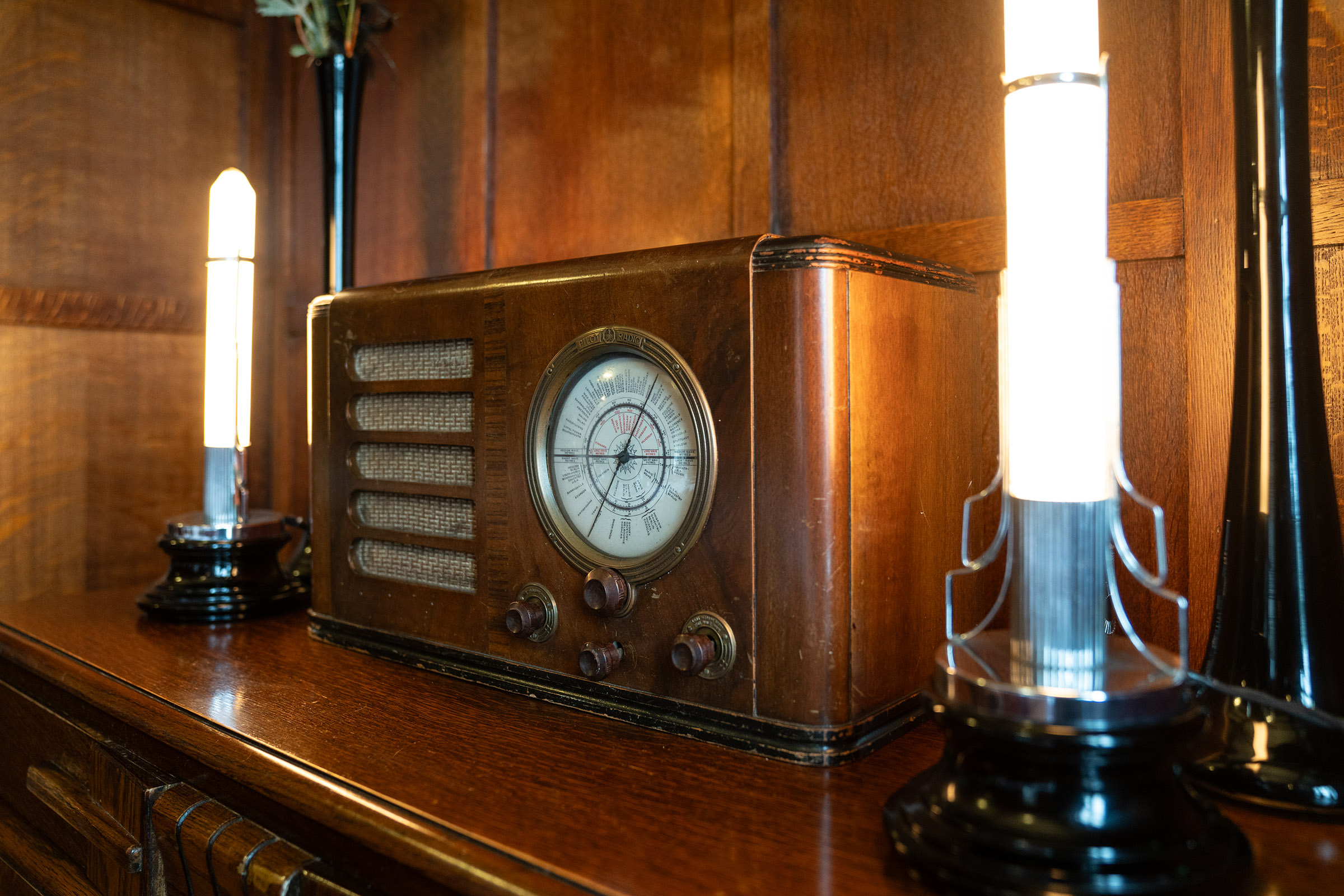 The 1930’s radio is straddled by glorious deco candle lamps which perfectly illuminate the room in the evening, and tall deco feather spray arrangements, which are derivations of those the present owner designed for her own wedding day. There is an original clock, gently ticking away on the wall in the corner, just like there would have been, back in the 1930’s.