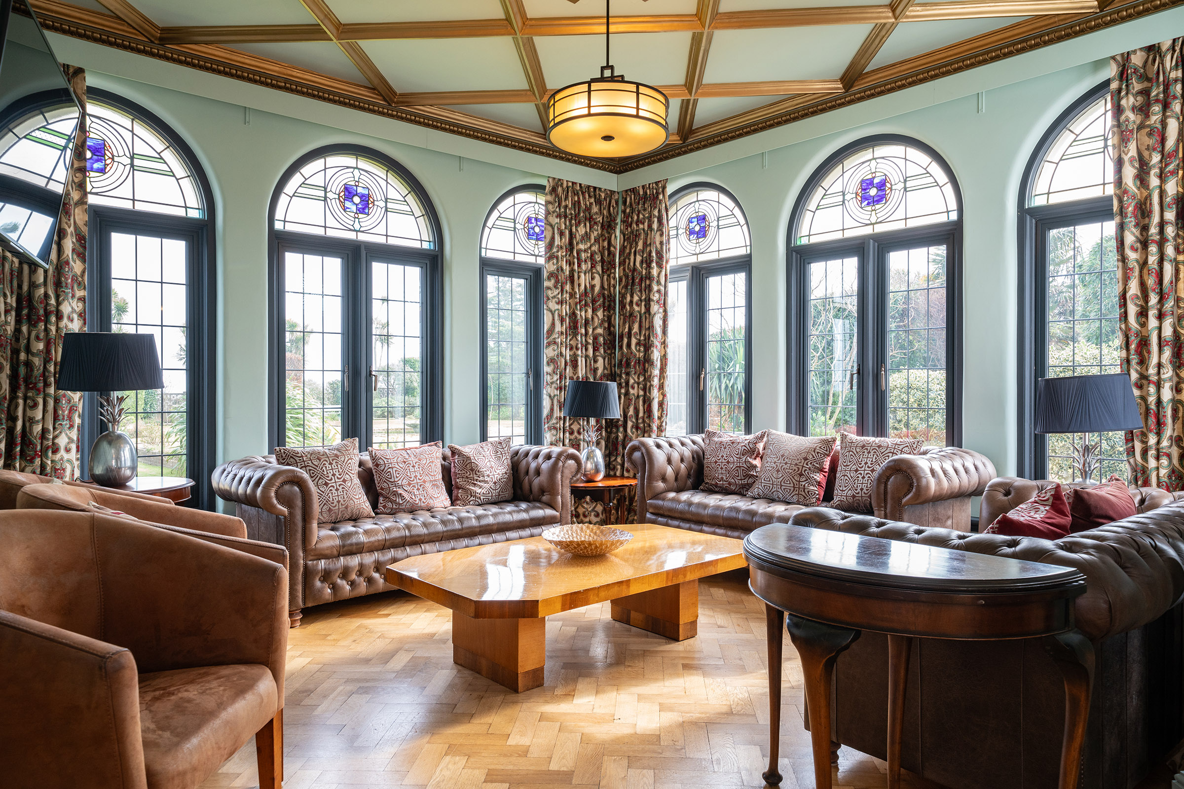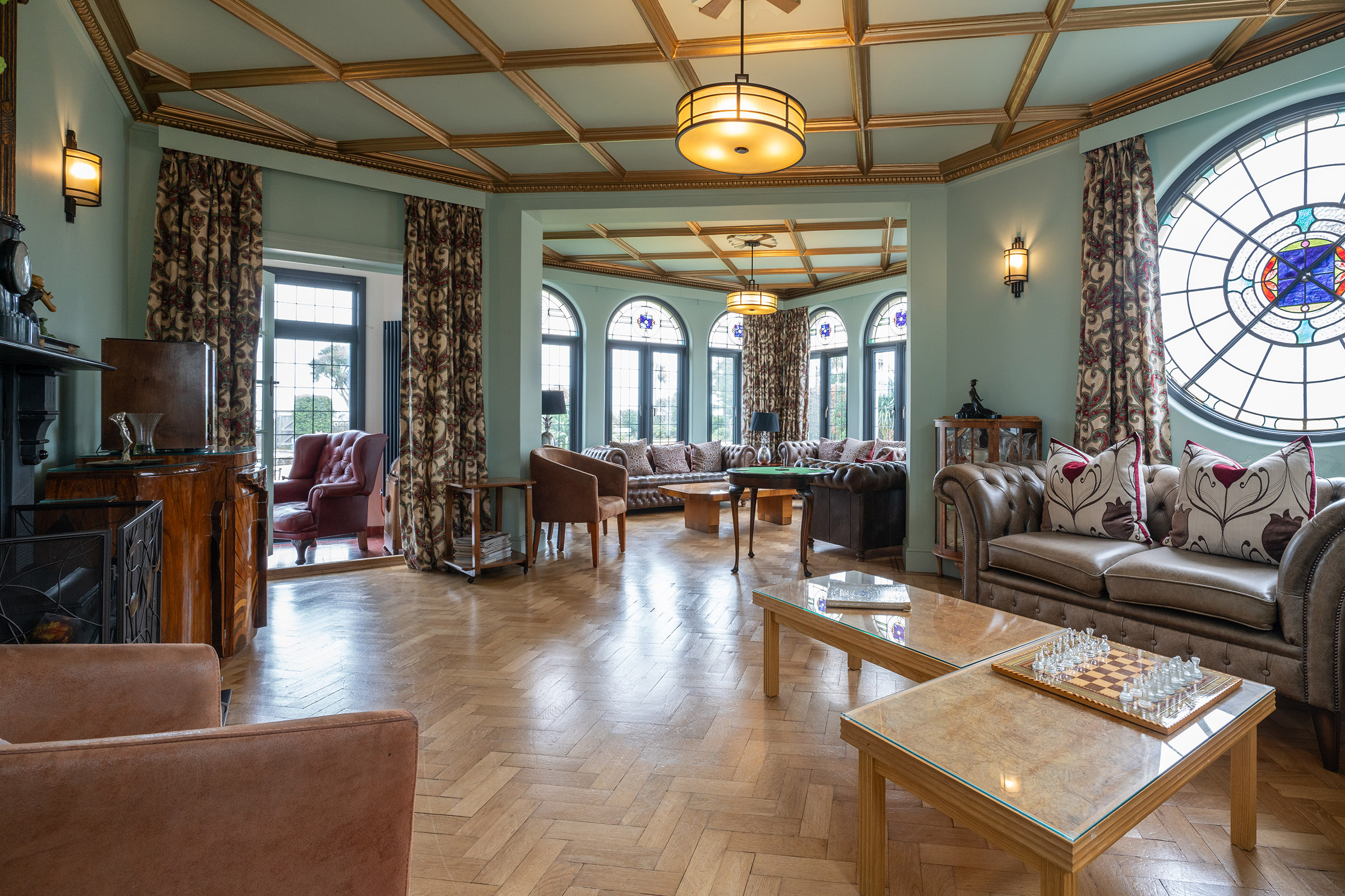 Oh yes, there is a TV if you need it, and a Sonos sound system too (hidden in the Art Deco Radio, hiding with Alexa), but sit around the decadently proportioned Deco coffee table-surely you all need to gather and have a drink together? And look closer at the half table near to the door to the garden room…..lift the lid, and see how it converts to a card table for a post-supper poker game.